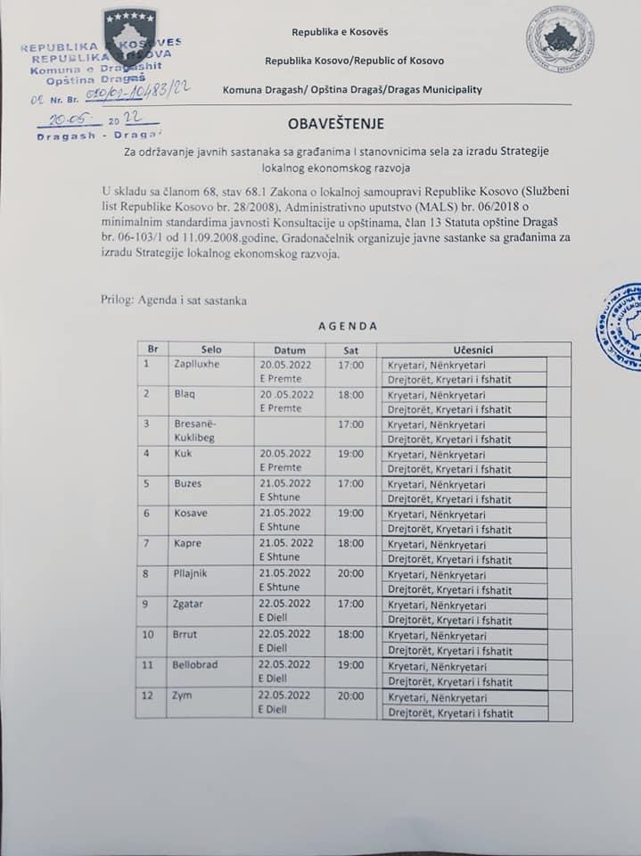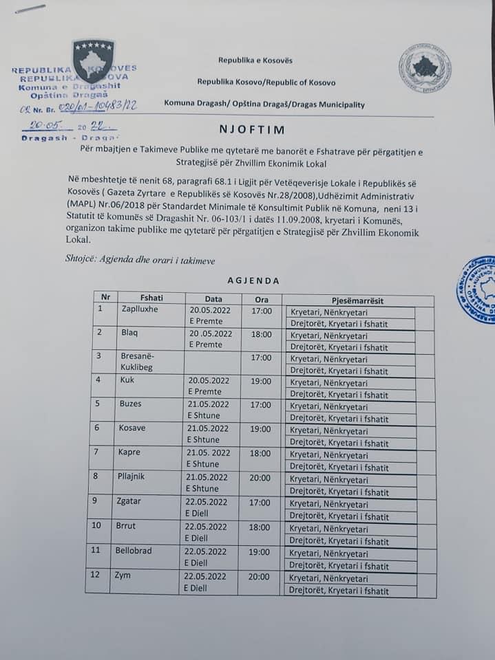 Për mbajtjen e Takimeve Publike me qytetarë me banorët e Fshatrave për përgatitjen e Strategjisë për Zhvillim Ekonimik Lokal.